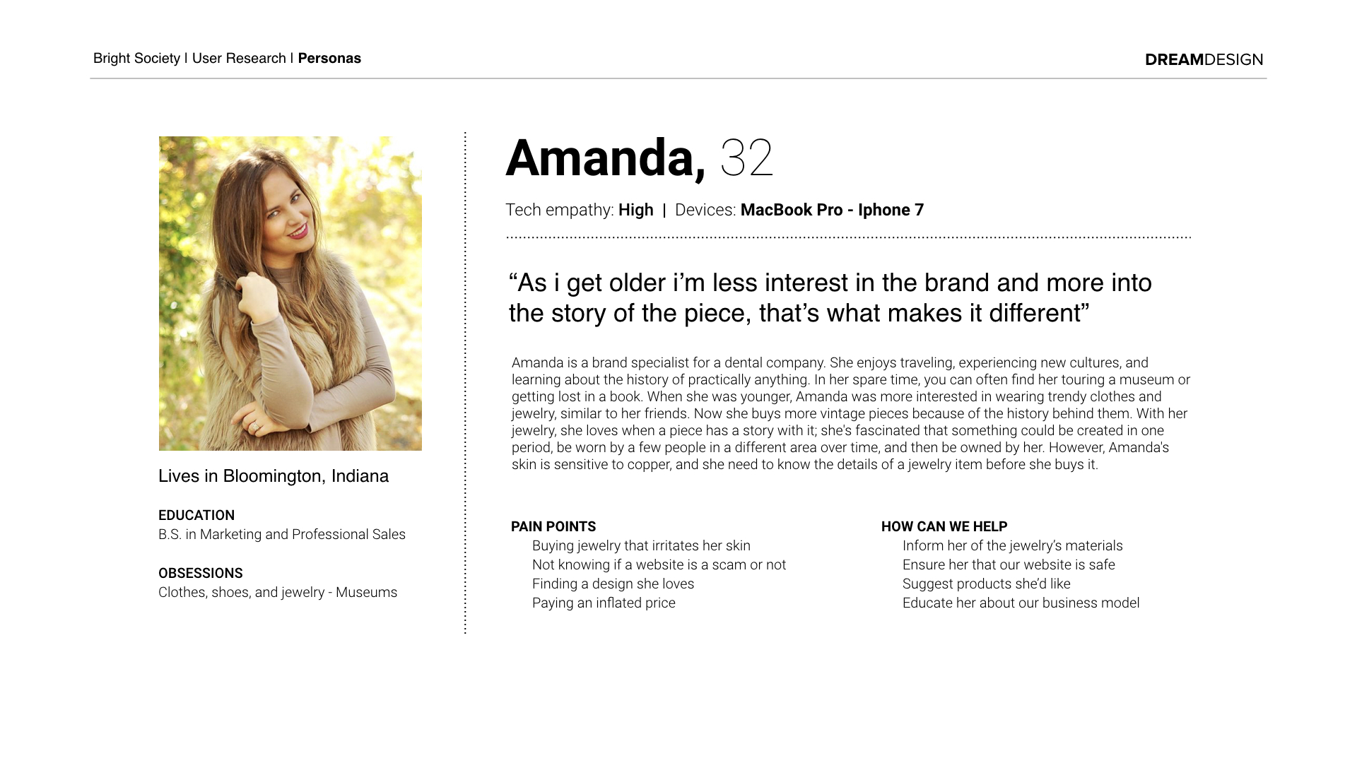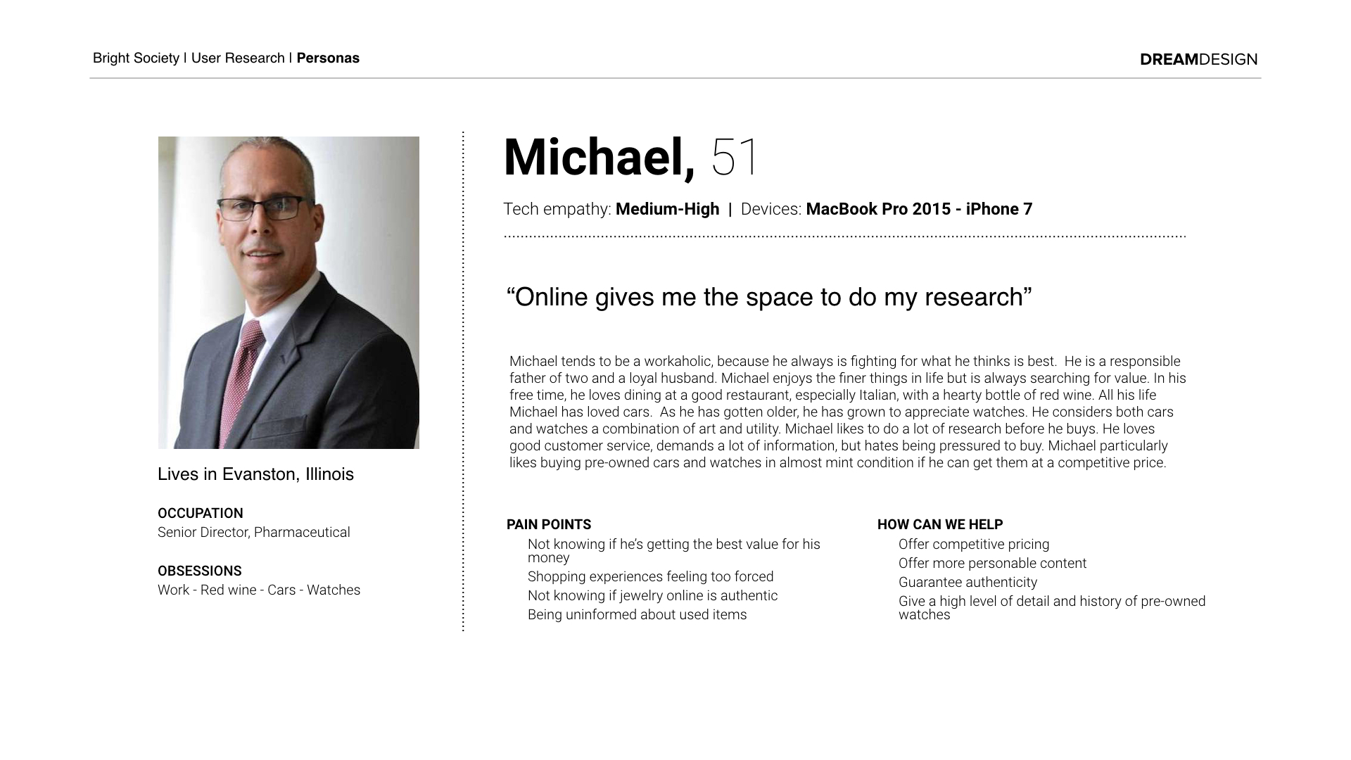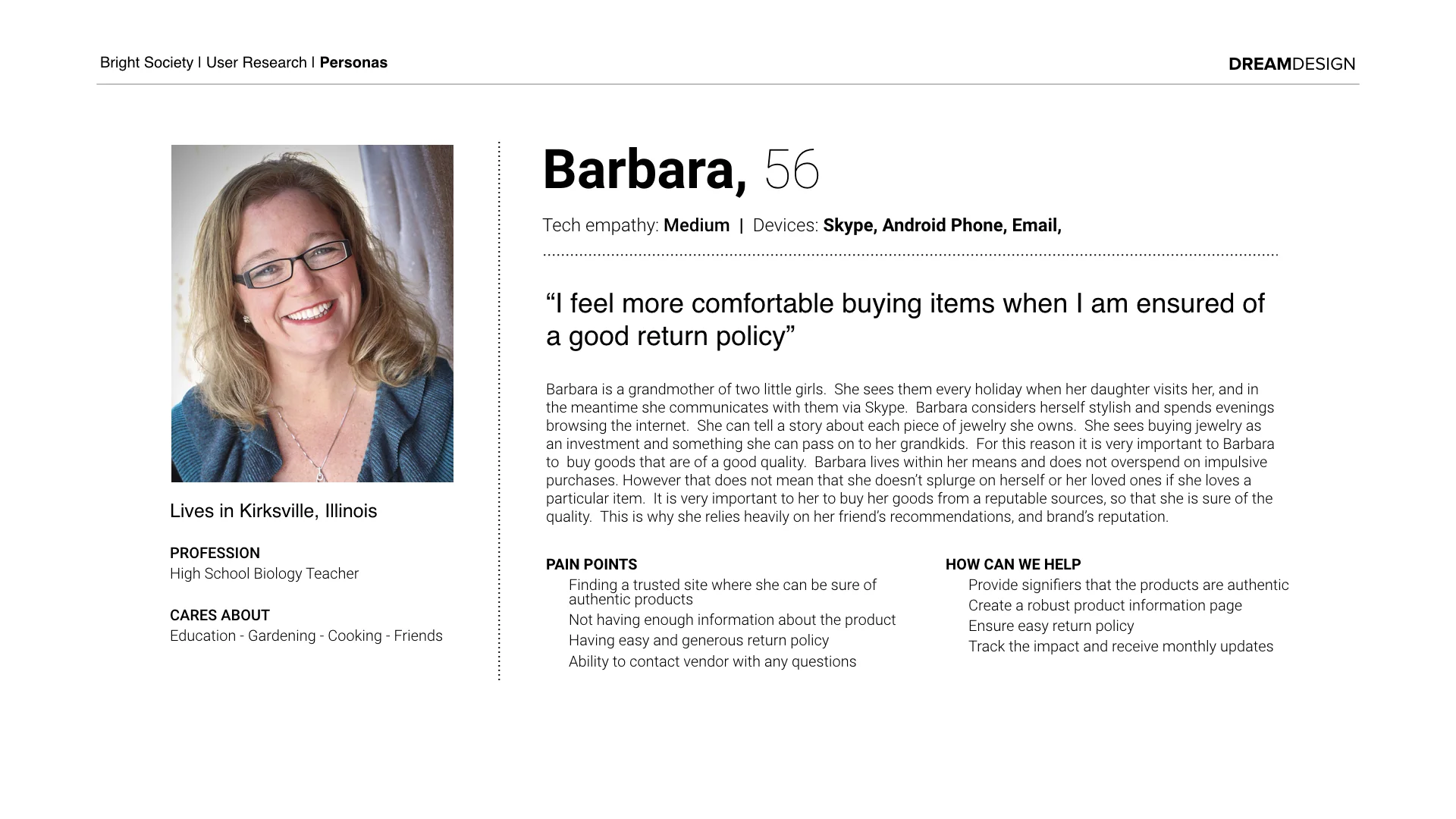 Using our research findings, we created 3 personas - Barbara, Amanda and Michael. These personas were also an extension of personas already created for Bright Society from a marketing firm.