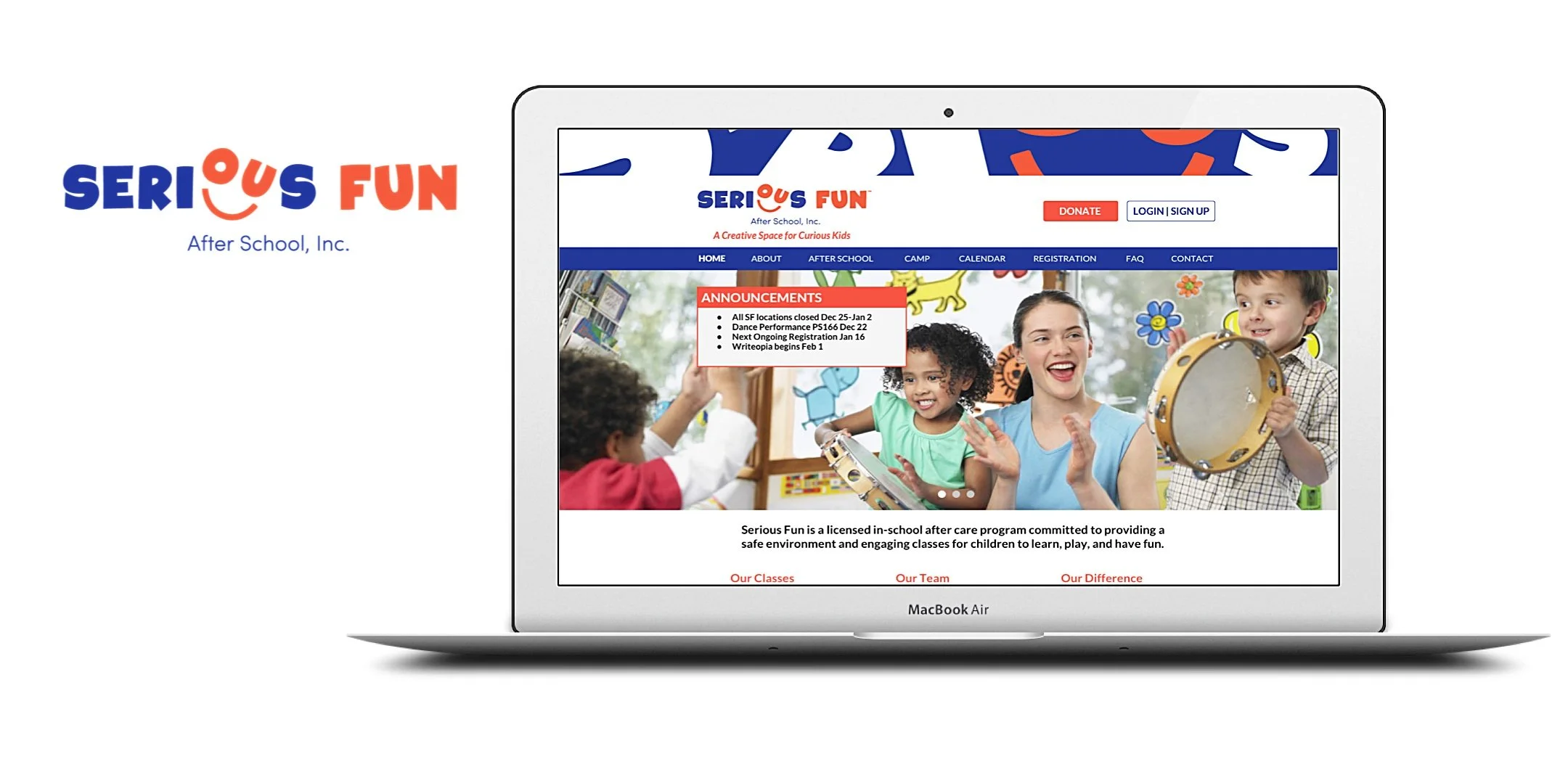 We knew the home page was crucial. Not only did it have to be informational, it had to be inspirational. We added a hero image of children enjoying to learn, a clear statement about Serious Fun's business, prominent buttons to login/sign up and donate and an announcement banner with up to date information so that users would return to the site for information.